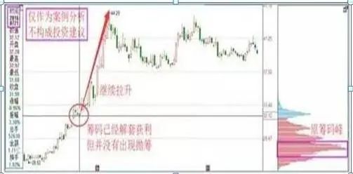 但是由于主力具有很多散户不具有的优势(资金、团队、技术等),所以主力被套之后解套会相对容易,而且他们在解套之后并不像散户一样急着出货,而是继续持有获取目标收益。这在筹码图中可以很清晰的体现出来,筹码峰从股票从蓝变红不仅没有变动,反而有凝聚的现象,这必然是主力所为。